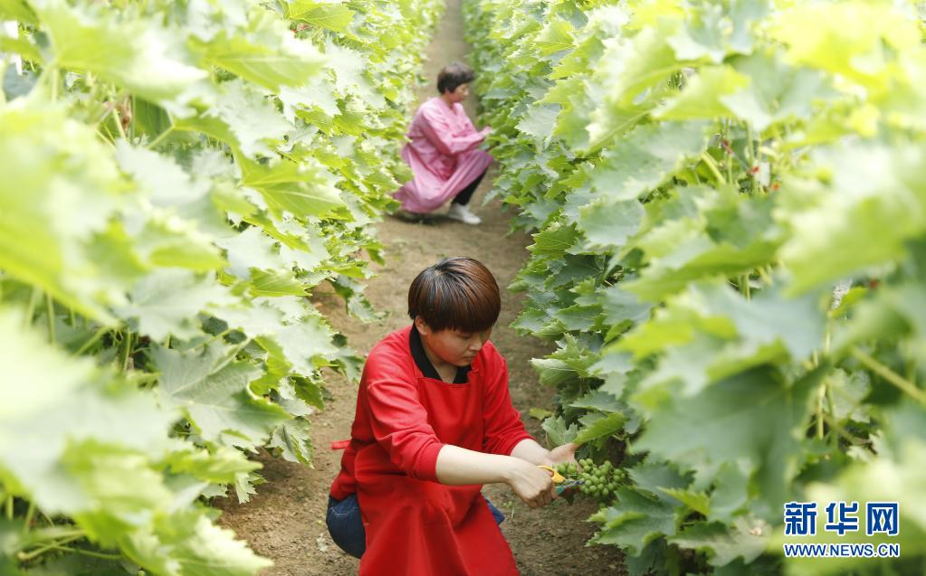 5月21日,新河县新河镇五里铺村村民在大棚里给葡萄疏果。
