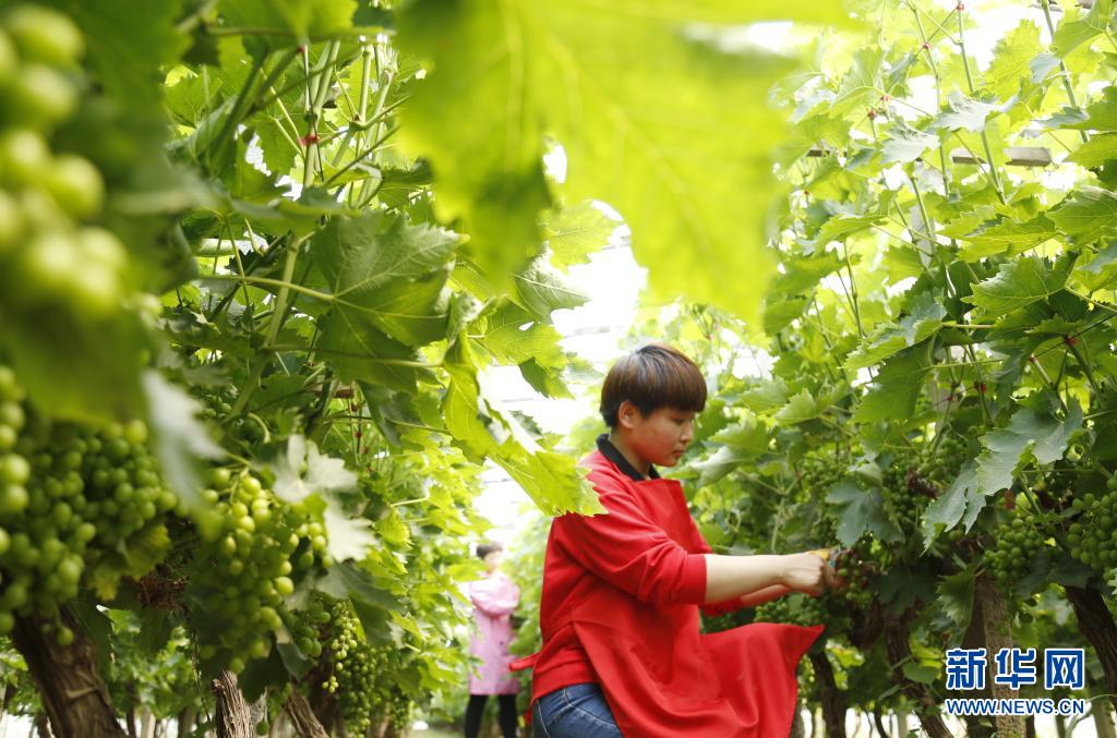 5月21日,新河县新河镇五里铺村村民在大棚里给葡萄疏果。