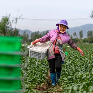 5月21日,工人在宁夏固原市原州区河东万亩冷凉蔬菜基地采摘菜心。