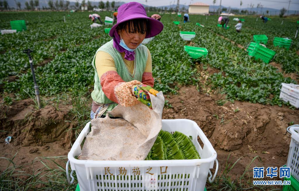 5月21日,工人在宁夏固原市原州区河东万亩冷凉蔬菜基地为摘下的菜心保湿。新华社记者 冯开华 摄