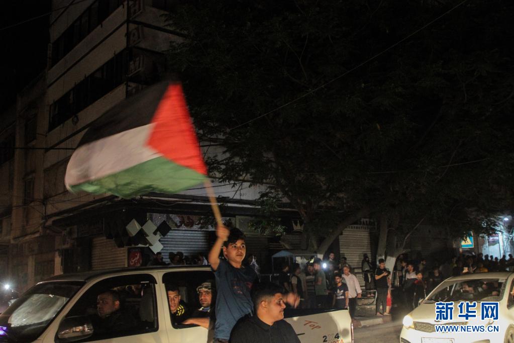 5月21日,一名男子在加沙城的庆祝活动上挥舞巴勒斯坦国旗。新华社发(里泽克·阿卜杜勒·贾瓦德摄)