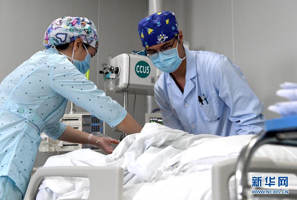刘光耀(右)和乔冰(左)在河南省直第三人民医院急重症医学中心病房内帮助病人更改体位(2020年4月26日摄)。新华社记者 李安 摄