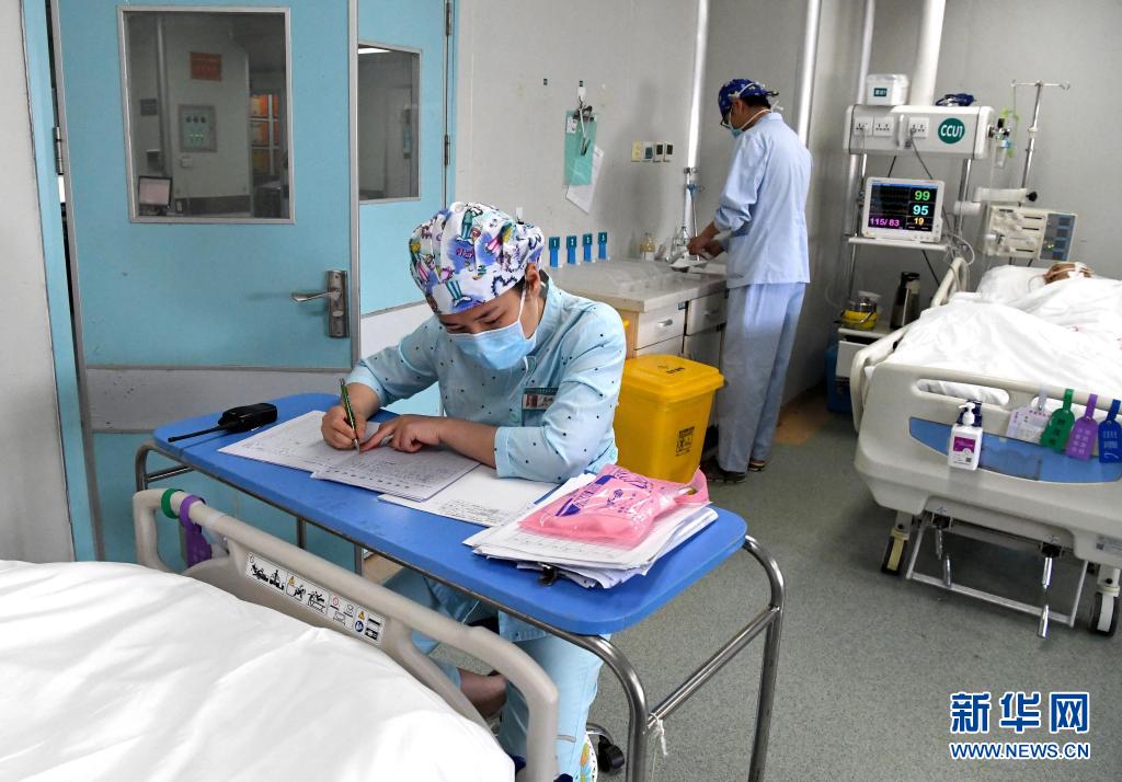 乔冰(前)在河南省直第三人民医院急重症医学中心病房内写护理记录,刘光耀(后)在准备医疗用品(2020年4月26日摄)。新华社记者 李安 摄