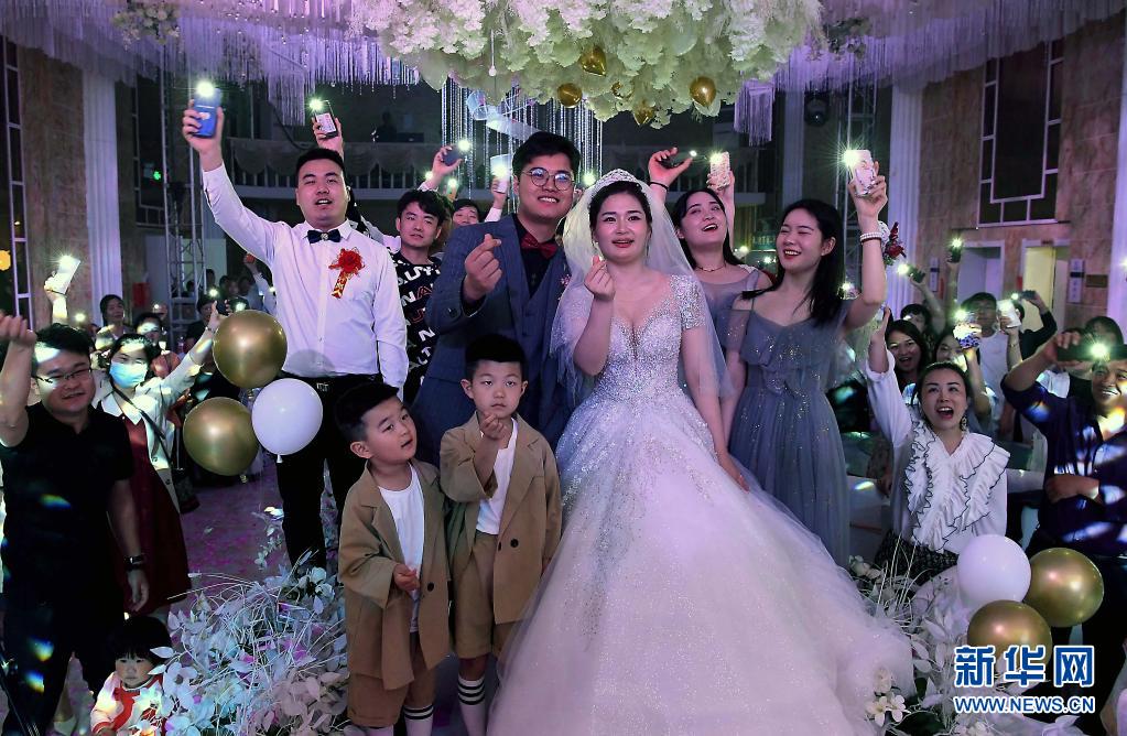 5月20日,刘光耀(立者右四)、乔冰(立者右三)在婚礼上和亲友合影。新华社记者 李安 摄