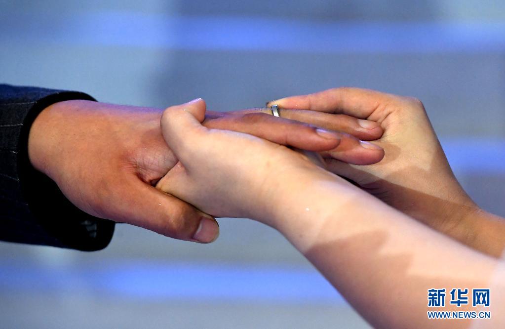 5月20日,乔冰在婚礼上为刘光耀戴上婚戒。新华社记者 李安 摄