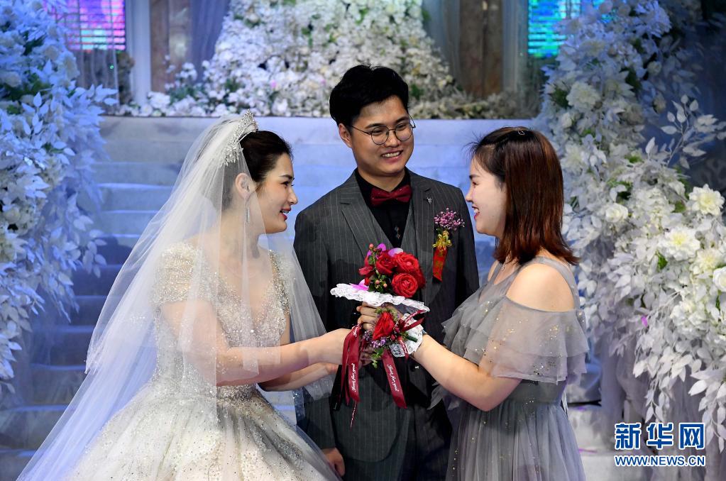 5月20日,乔冰(左)在婚礼上将手捧花交给伴娘。新华社记者 李安 摄