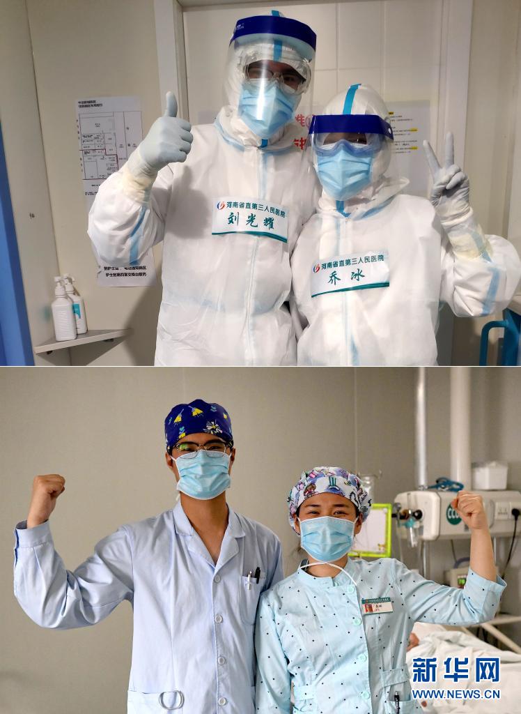 这是一张拼版照片:上图为:刘光耀(左)和乔冰在武汉同济医院中法新城院区穿好防护服准备进入病区(资料照片,新华社发);下图为:2020年4月26日,刘光耀(左)和乔冰在河南省直第三人民医院急重症医学中心病房内(新华社记者李安摄)。新华社发