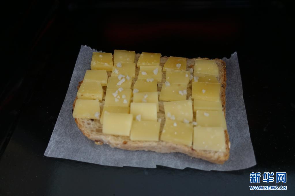 这是4月24日在法国巴黎拍摄的孔泰奶酪和食盐配面包片在烤箱中。