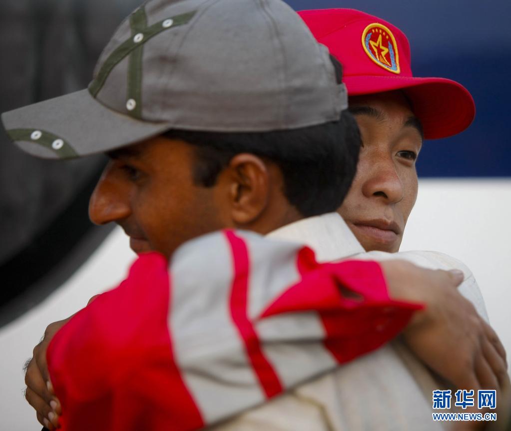 2010年巴基斯坦爆发持续一个多月的特大洪灾,中国国际救援队分两批前往受灾最严重的特达地区展开医疗救助。这是2010年9月14日,准备启程回国的中国国际救援队第一批队员在驻地同巴基斯坦工作人员相拥道别。新华社记者 周磊 摄