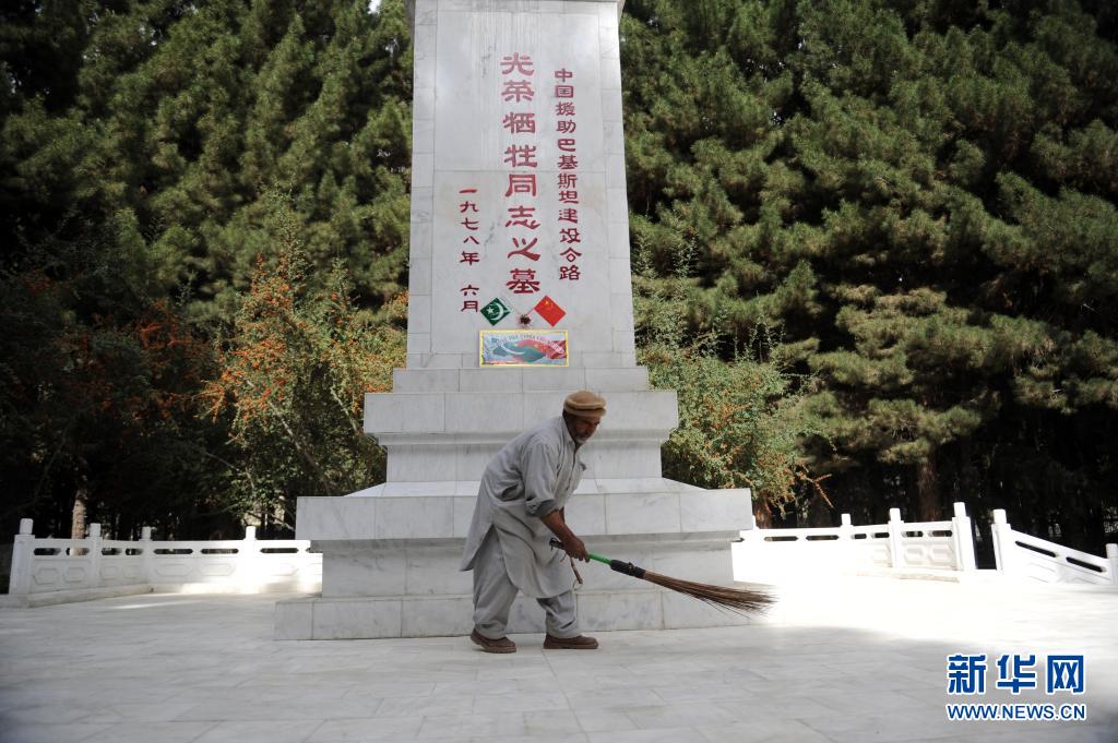 2015年3月25日,在巴基斯坦北部城市吉尔吉特东郊的丹沃尔村,自1978年起自愿在这里守护陵墓的阿里·艾哈迈德在打扫中国烈士陵园。88位为修筑喀喇昆仑公路而牺牲的中国建设者长眠于此。新华社记者 黄宗治 摄
