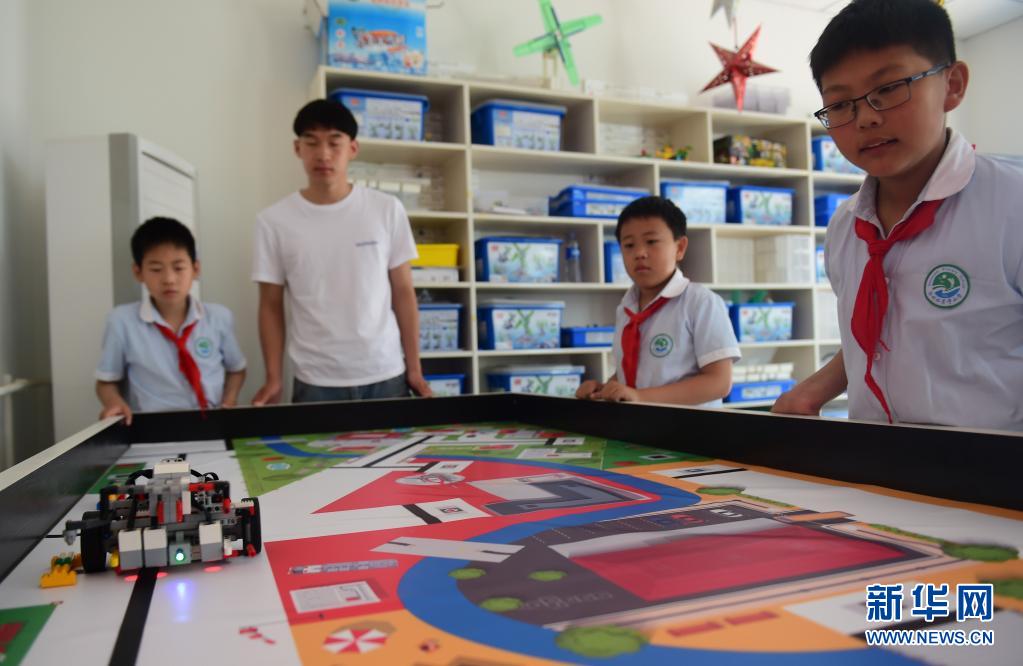 5月21日,沧州市运河区水月寺小学机器人社团学生在进行机器人运行演示。新华社发(傅新春 摄)