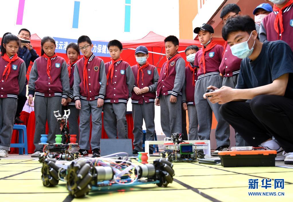 5月21日,在连云港市苍梧小学东校区,小学生观看机器人表演。新华社发(耿玉和 摄)