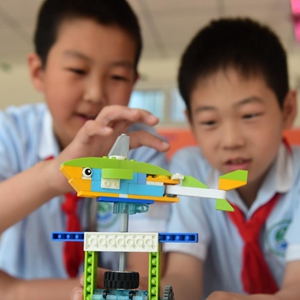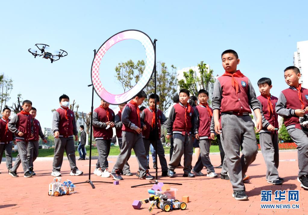 5月21日,在连云港市苍梧小学东校区,小学生观看无人机表演。新华社发(耿玉和 摄)