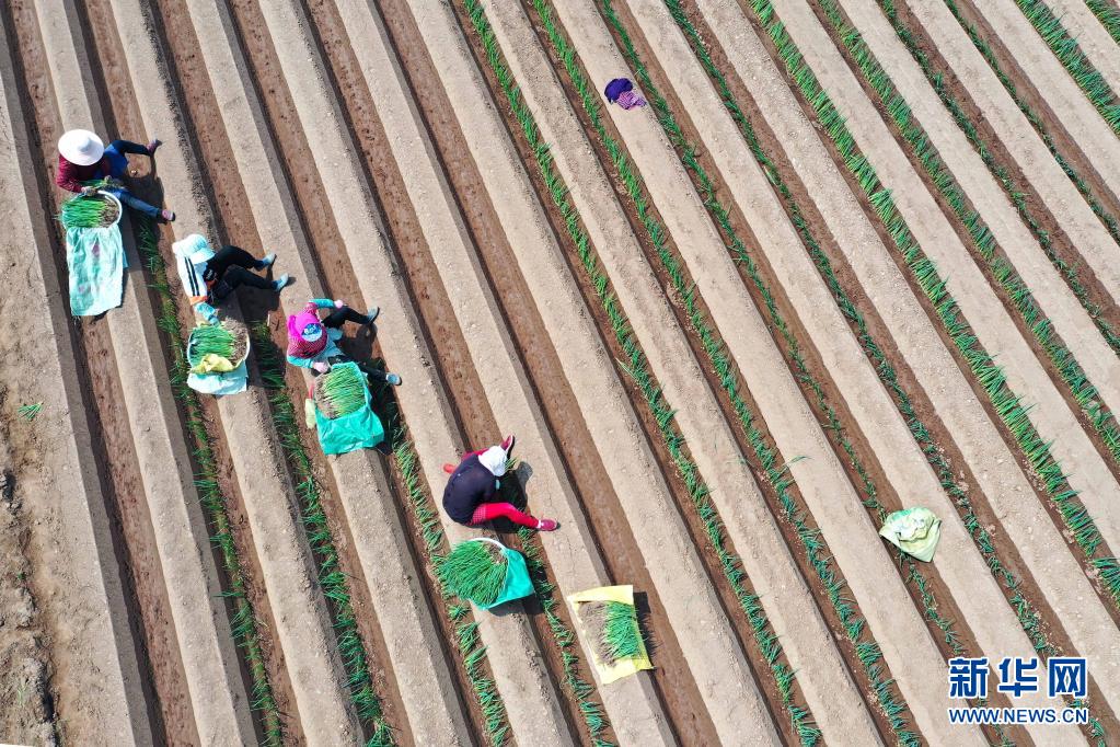 5月21日,山东省青州市东夏镇东夏村农民在栽植大葱(无人机照片)。新华社发(王继林 摄)