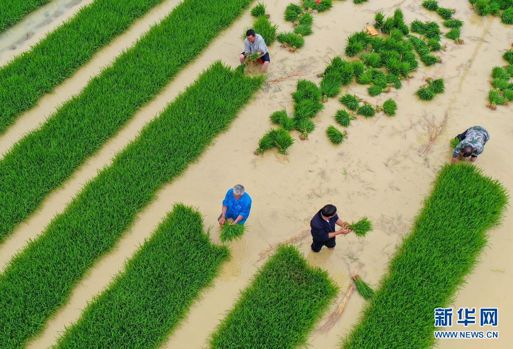 5月21日,村民在贵州省铜仁市玉屏侗族自治县新店镇沙水坪村水田里忙碌(无人机照片)。新华社发(胡攀学摄)