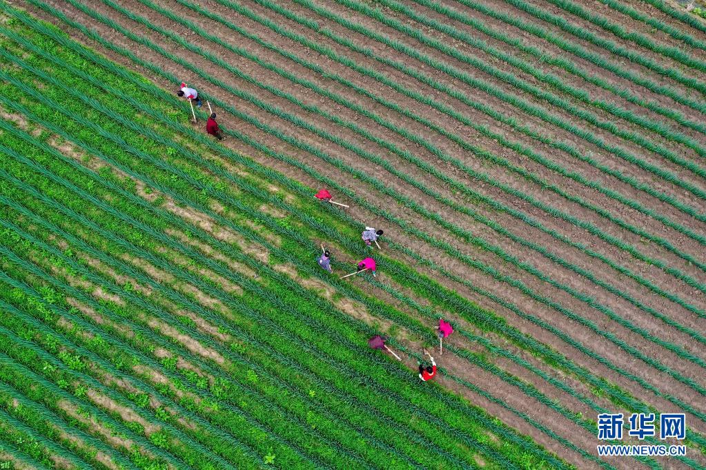 5月21日,贵州省遵义市余庆县白泥镇满溪村农民给大葱除草(无人机照片)。新华社发(周磊摄)