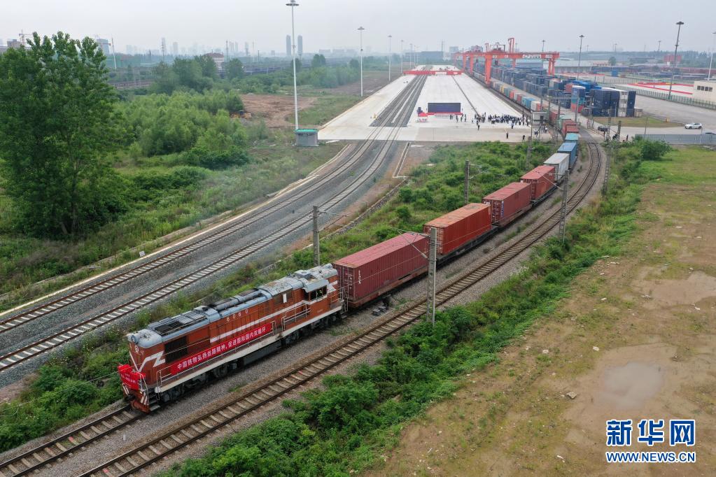 5月20日,开往哈萨克斯坦阿拉木图的班列从武汉吴家山站驶出(无人机照片)。