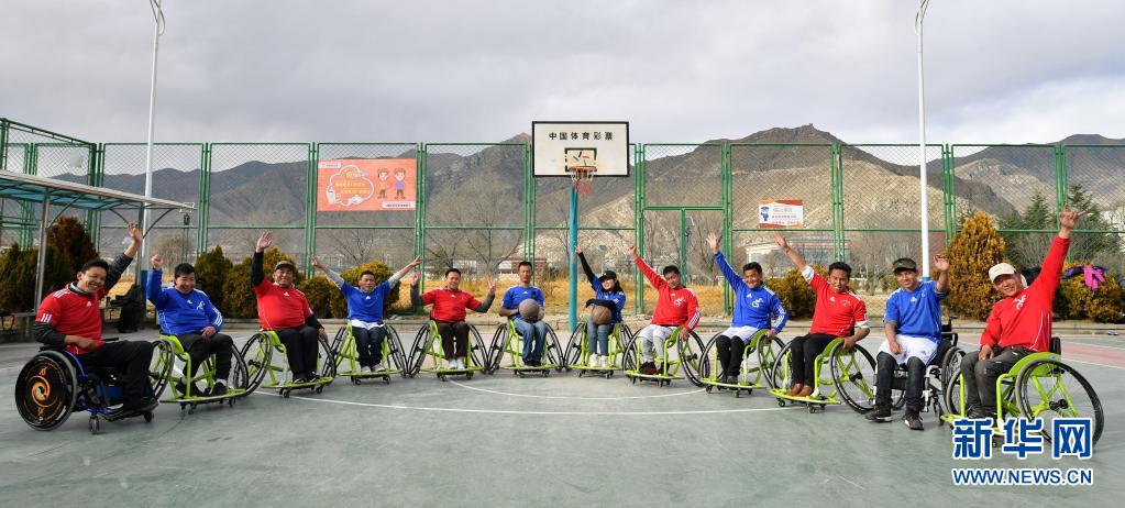 拉萨业余轮椅篮球队在位于拉萨北郊的一处篮球场合影(2019年3月3日摄)。