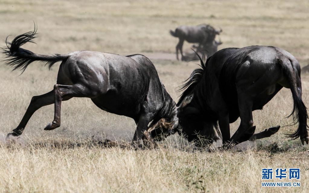 2016年7月23日,两只角马在肯尼亚马赛马拉保护区互相角力。