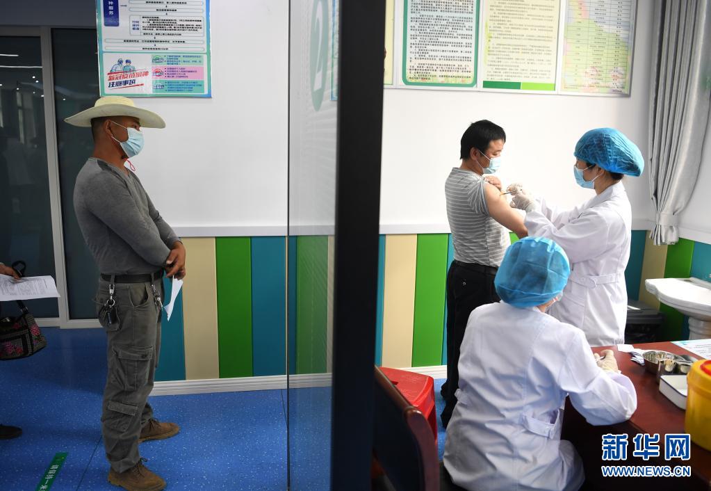5月21日,在肥西县铭传乡卫生院疫苗接种点,医护人员在为居民接种新冠疫苗。