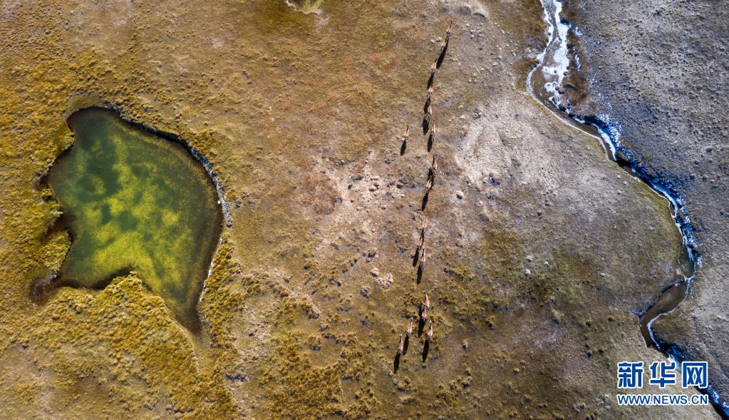 2019年10月19日,藏野驴在三江源地区活动(无人机照片)。