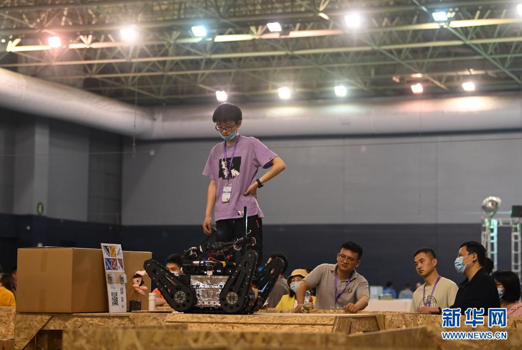 5月21日,参赛队员跟随机器人进行RoboCup救援组比赛。新华社记者 李然 摄