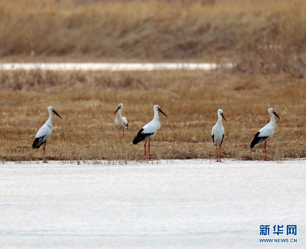 几只东方白鹳在查干湖岸边休息(2020年3月22日摄)。新华社发