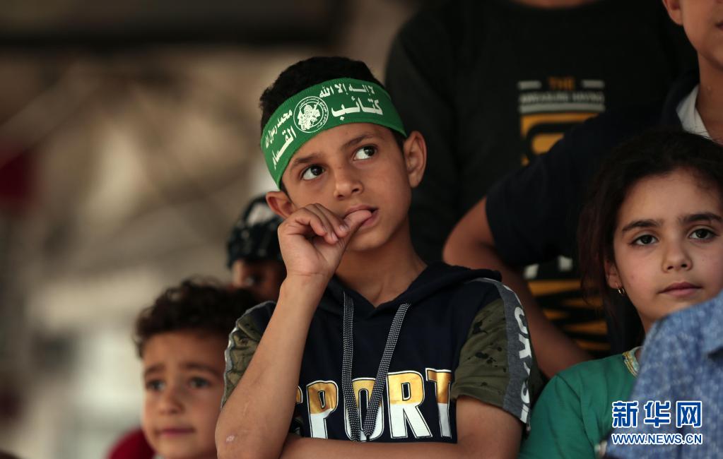 5月21日,巴勒斯坦儿童在加沙地带城市汗尤尼斯参加集会,庆祝停火协议达成。新华社发(亚西尔摄)