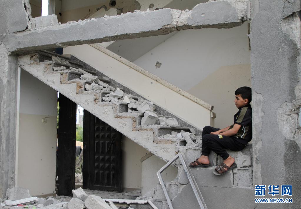 5月21日,在加沙地带北部的贝特拉西亚,巴勒斯坦儿童坐在遭以军空袭损毁的自家房屋废墟上。新华社发(里泽克·阿卜杜勒·贾瓦德摄)