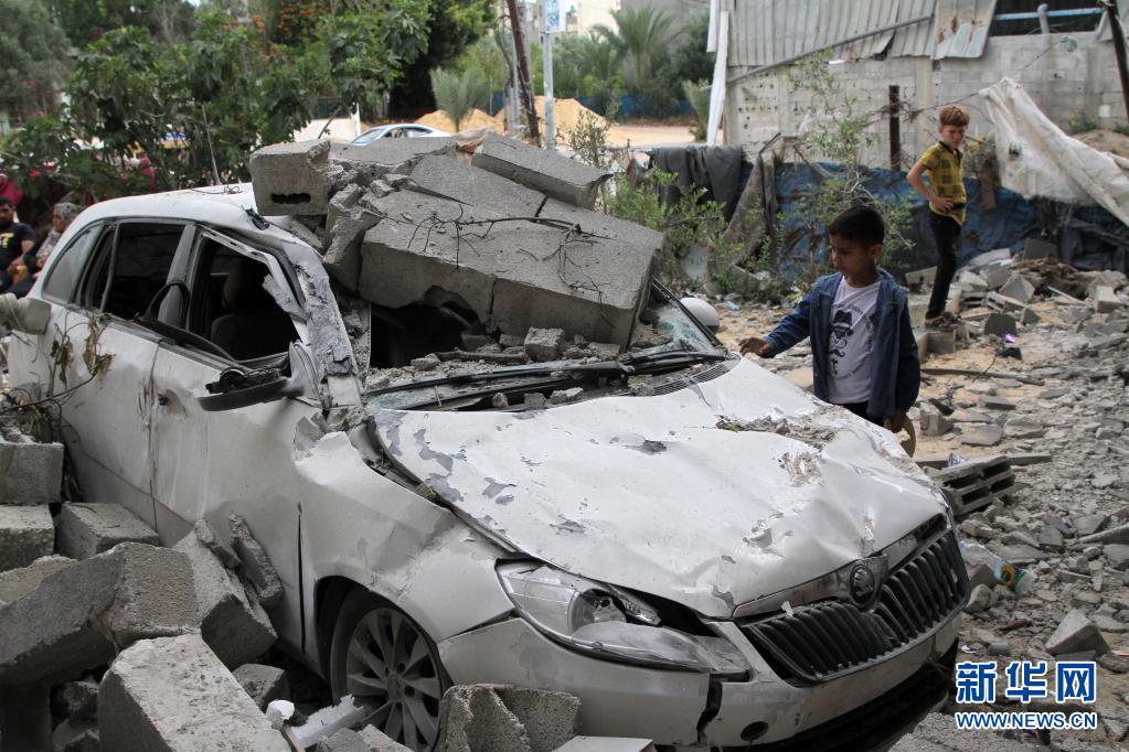 5月21日,巴勒斯坦儿童在加沙地带北部的贝特拉西亚查看遭以军空袭损毁的车辆。新华社发(里泽克·阿卜杜勒·贾瓦德摄)