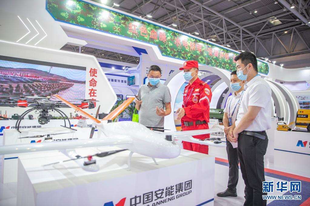 5月21日,观众在西洽会中国安能集团展区参观救援无人机。