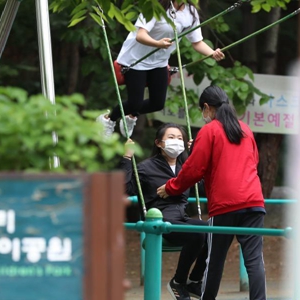 5月21日,戴口罩的青少年在韩国首尔的一个公园荡秋千。