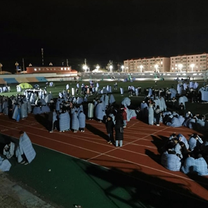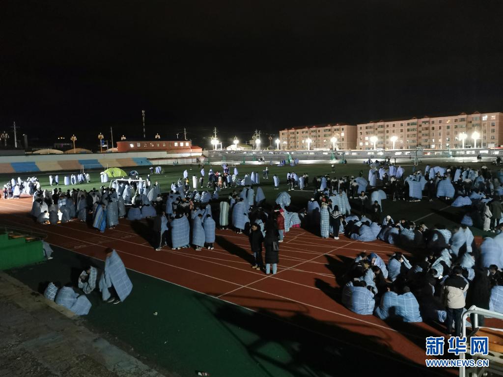 5月22日凌晨,在青海省果洛藏族自治州州府玛沁县,果洛州民族高级中学的学生在操场避险。