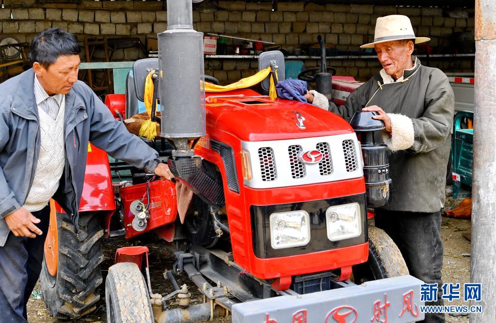 多扎木(右)在擦拭自家的拖拉机(3月20日摄)。