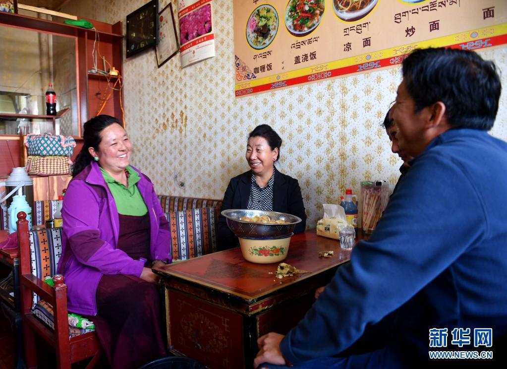 拉萨市城关区纳金街道塔玛村党委第一书记格桑卓嘎(中)在拉萨德吉吉祥茶馆和茶馆老板德吉(左)叙家常(2017年10月10日摄)。