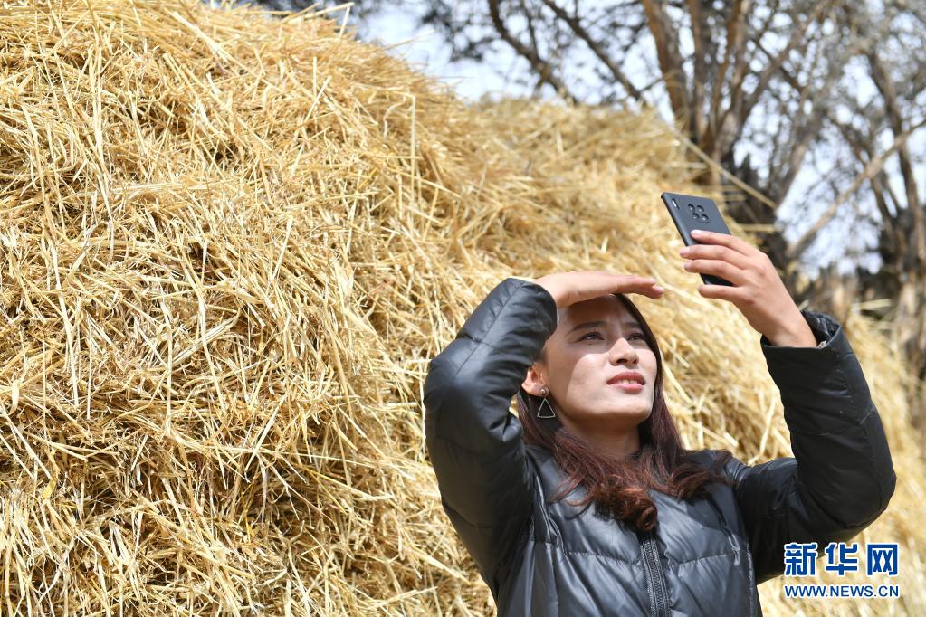 扎西拉姆在山南市琼结县久河村的家里通过网络直播和粉丝交流(4月2日摄)。