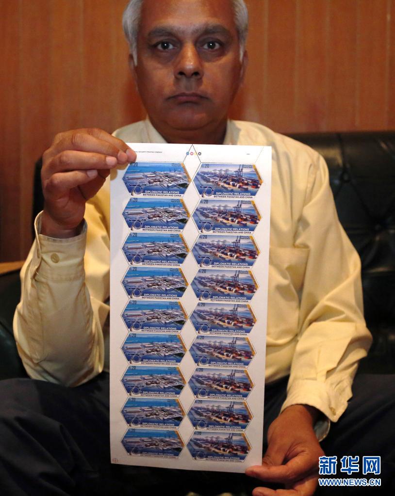5月21日,巴基斯坦邮政工作人员在首都伊斯兰堡展示新发行的巴基斯坦与中国建交70周年纪念邮票。新华社发(艾哈迈德·卡迈勒摄)