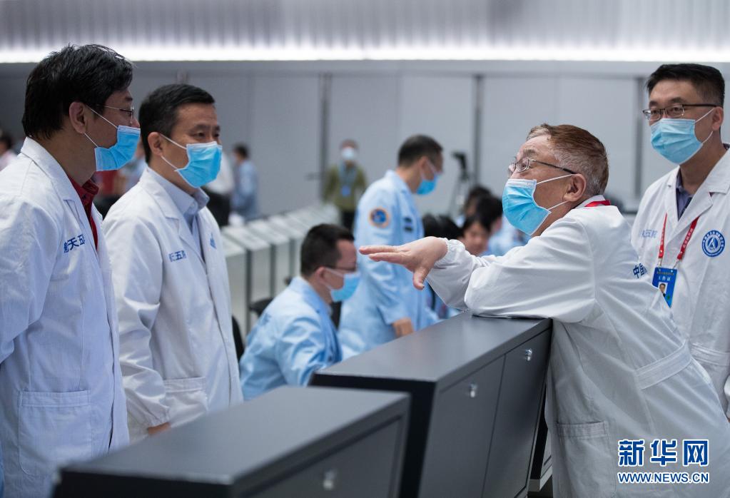 5月22日 ,在北京航天飞行控制中心,“祝融号”火星车安全驶离着陆平台后,中国航天科技集团五院技术顾问、中国科学院院士叶培建(右二)和天问一号火星探测器系统总设计师孙泽洲(左二)等专家在一起交流。