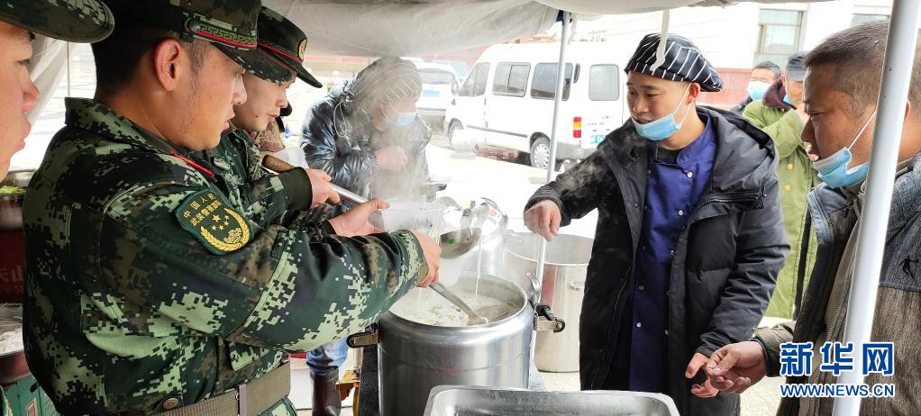 5月22日,在青海果洛州玛多县,武警青海总队果洛支队官兵在玛多县玛查理镇县政府广场为受灾群众准备热食(手机照片)。