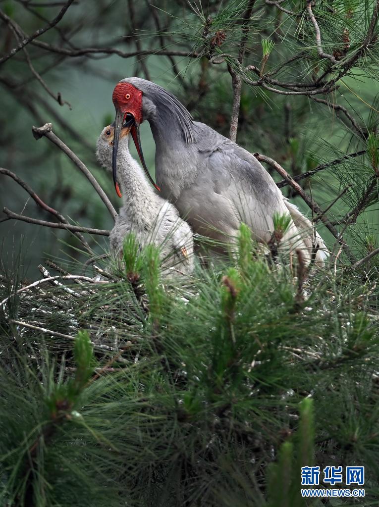 5月21日,在洋县龙亭镇梁河村一处密林里,一只成鸟朱鹮在为幼仔喂食。新华社记者 陶明 摄