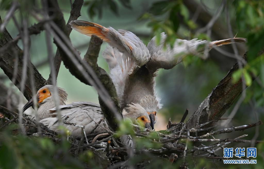 5月20日在洋县溢水镇老庄村的一处朱鹮巢点拍摄的三只朱鹮幼鸟。新华社记者 陶明 摄