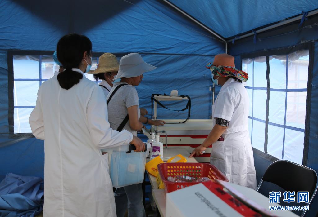 5月22日,医务人员在漾濞县街头搭建的救灾帐篷内布置简易医疗室。