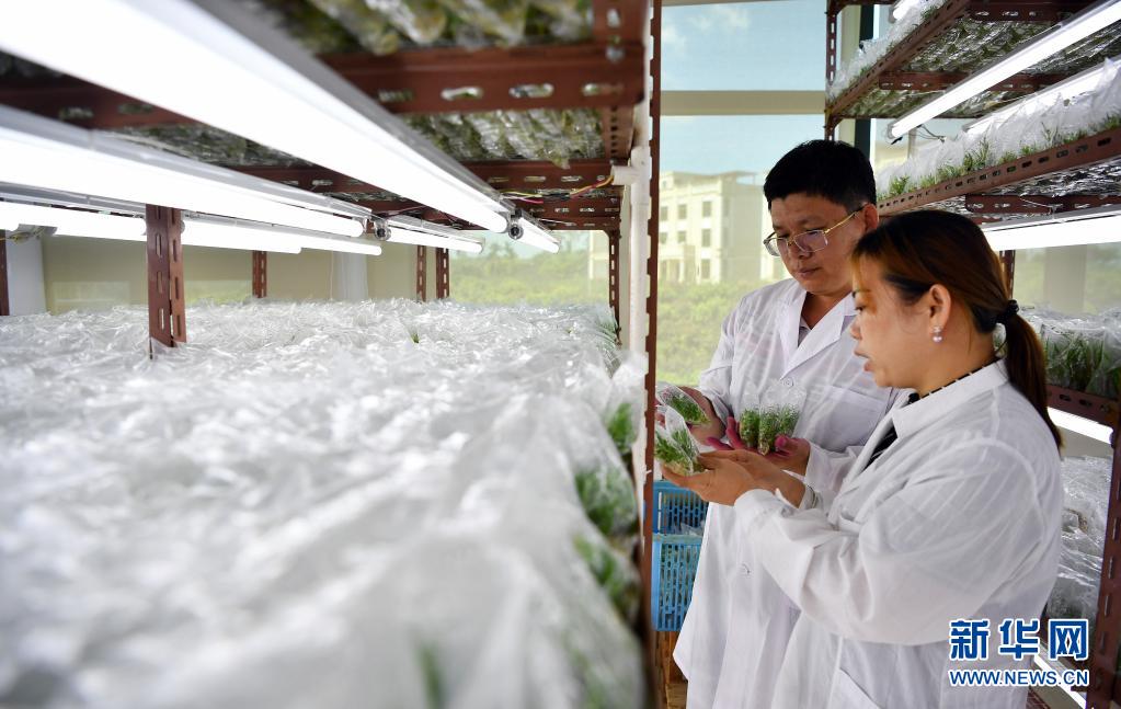 5月21日,科研人员在国家(海南)热带植物隔离检疫中心组培中心检查植株生长情况。