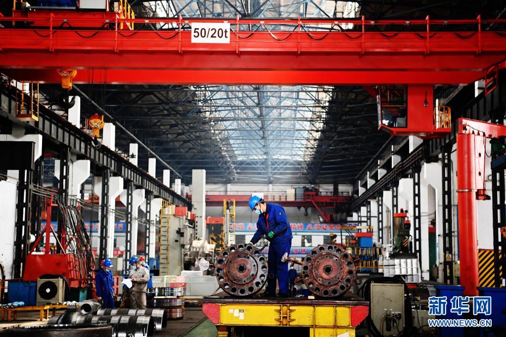 工人在哈电集团哈尔滨汽轮机厂有限责任公司生产车间作业(4月15日摄)。