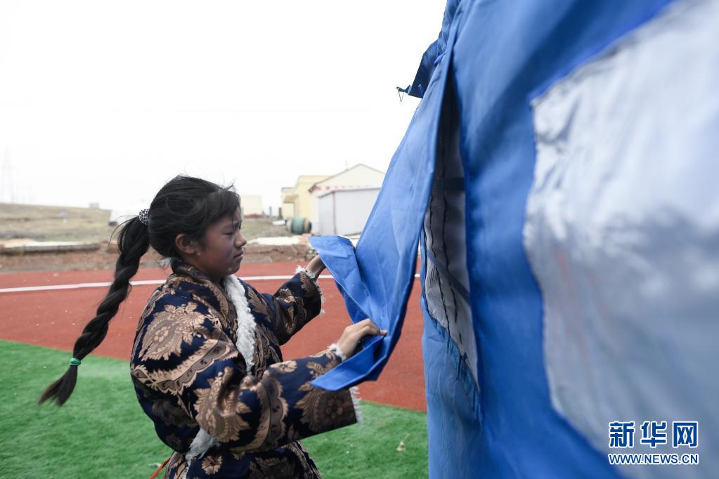 5月22日,在玛多县黄河乡寄宿制学校救灾安置点,一名学生在帮忙整理帐篷。
