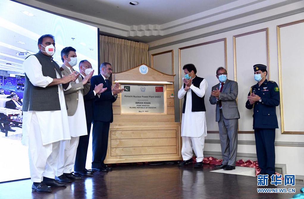 5月21日,巴基斯坦总理伊姆兰·汗(右三)在首都伊斯兰堡出席中国“华龙一号”海外首堆工程卡拉奇核电站2号机组商运验收仪式。