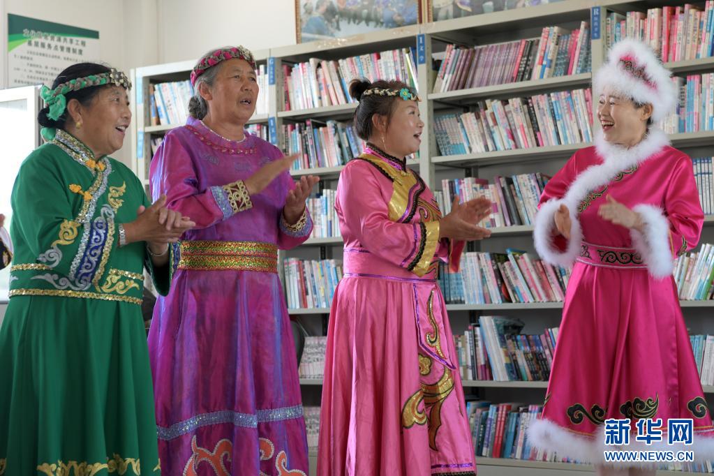 在同江市八岔赫哲族伊玛堪传习所,脱贫户周洪香(左二)和学员们演唱伊玛堪(2020年7月21日摄)。