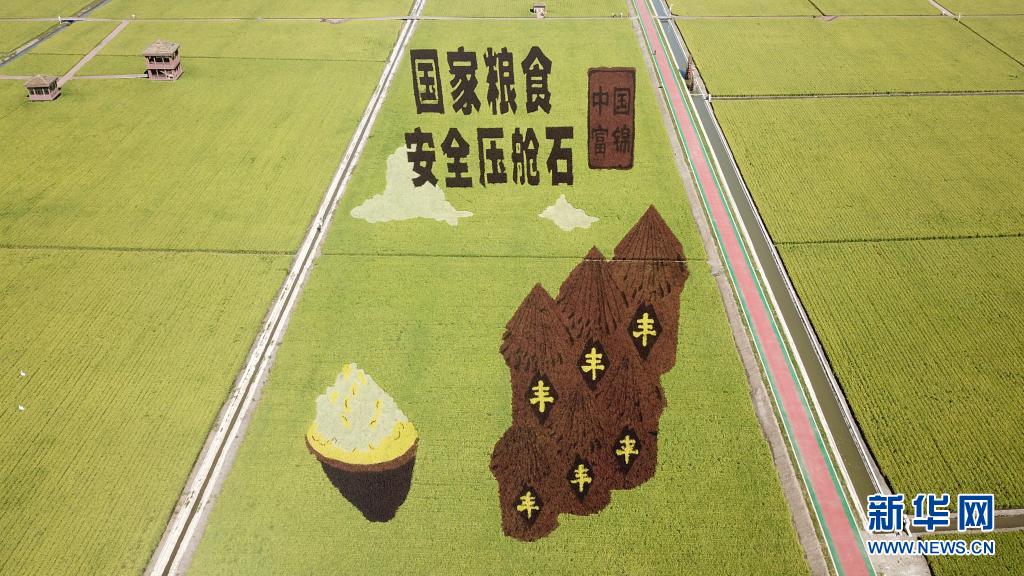 这是富锦市万亩水稻公园中的稻田画(2020年8月21日摄,无人机照片)。