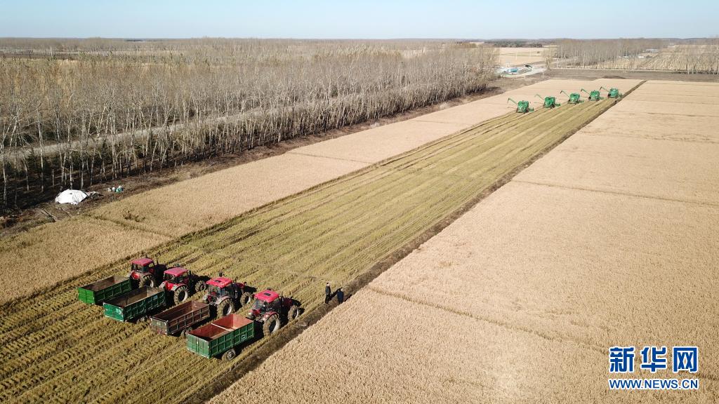 农机在北大荒集团红卫农场有限公司的田间收获水稻(2020年10日16日摄,无人机照片)。