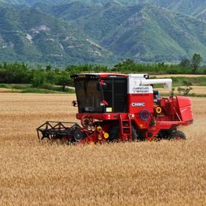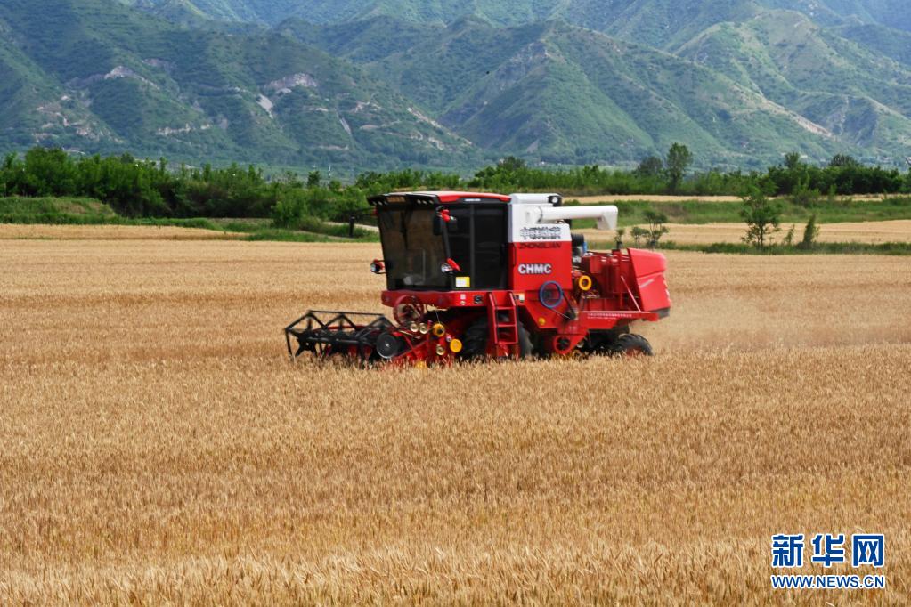 5月22日,收割机在运城市盐湖区银张村的麦田里作业。